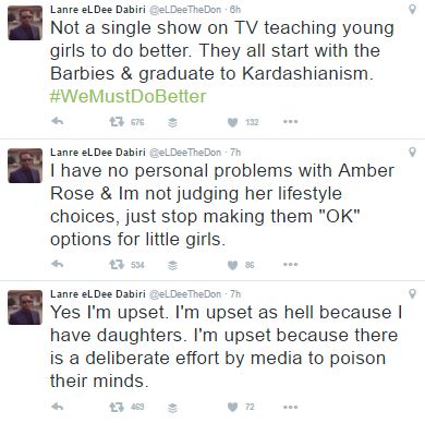 The rapper doesn’t seem impressed about how celebrities like Kim Kardashian (and the Kardashians) as well as Amber Rose are selling ‘sex’ to make millions of dollars. According to him it has a bad influence on the next generation especially his daughters. Eldee, would be happier if the world celebrates women doing more orthodox stuff.