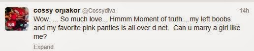 Can you marry a girl like me? – Cossy Ojiakor Posted by: b3rrilyn in Celebrity News Oct 28, 2013 So guys would you marry her? cossy orjiakor 2013-10-28 b3rrilyn