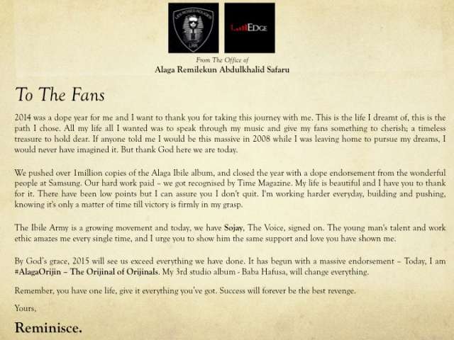 Reminisce had a very good 2014 with a successful album and his Samsung endorsement, but what most of us did not know is how many copies his sophomore album Alaga Ibile sold.. 1 million actual copies were sold.. BIG!!!