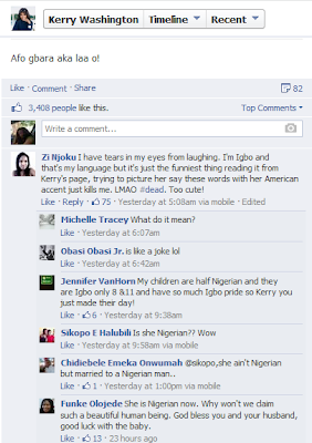 Pregnant actress Kerry Washington who is married to Nigerian NFL player Nnamdi Asomugha posted her new year message (facebook & twitter) in Igbo. The message reads “Afo gbara aka laa oo” According to a translator, it means “May your year go without mishap.” Cute couple!!