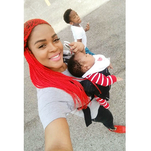 Spotting a new look in red hair, the former Most beautiful Girl in Nigeria, Adaeze was spotted enjoying a stroll with her boys in their London home.