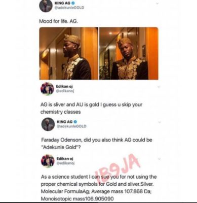 Adekunle Gold is known for his savagery, was challenged by a fan for using a wrong chemical symbol to represent Gold.