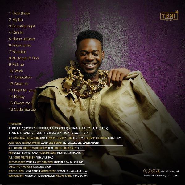 The multi talented Adekunle Gold took to his instagram page to unveil the album cover, the official release date and list of tracks for his debut album, ‘Gold’.