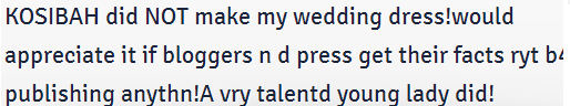 Annie Idibia reacted to stories that her wedding dress was designed by Kosiba and it costs 1.7 million.
