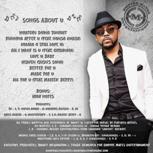 One of the song, titled Heaven is dedicated to Adesua Etomi, Banky W’s wife-to-be. Maleek Berry, Nonso Amadi and Chidinma are some of the artistes featured on “Songs About U” with production credits including Nonso Amadi, Cobhams Asuquo, Masterkraft, Chris Cubeta, Maleek Berry, Alex Deturk & Sukasounds.