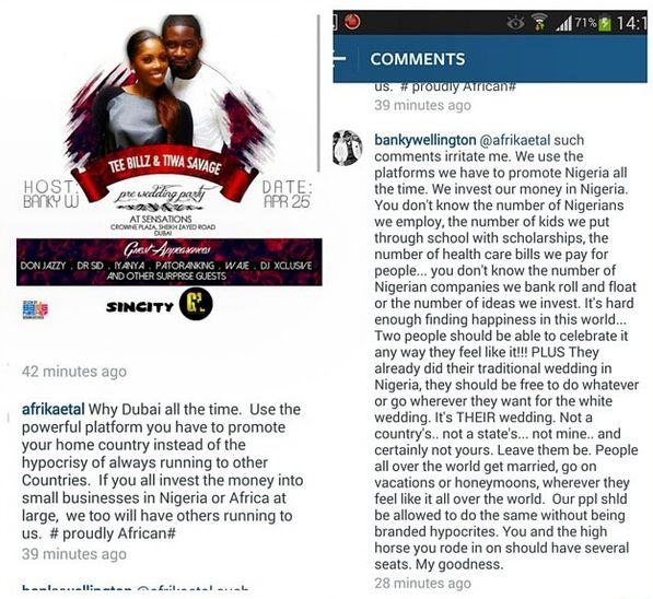After posting an image of a pre-party flier on his official Instagram page @bankywellington, a commenter who was appalled that they didn’t choose a Nigerian city for the nuptials on Saturday 26th April 2014 at the Armani Hotel, Dubai, had a few choice words.