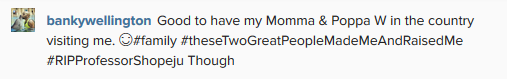 Banky W took to his instagram page earlier to share an adorable selfie of his mom and dad and we’re totally loving the photo. The singer who shared the photo said both his parents were presently in the country to visit him.. Lovely parents!