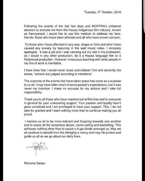 To those who I have offended in any way, shape or form and who I have caused any anxiety by featuring in the said music video, I sincerely apologise,” Sadau said in her statement released today. It was a job and I was carrying out my role in my profession, as I would in any other production, be it a Hausa language film or a Nollywood production. However, innocuous touching with other people in my line of work is inevitable.