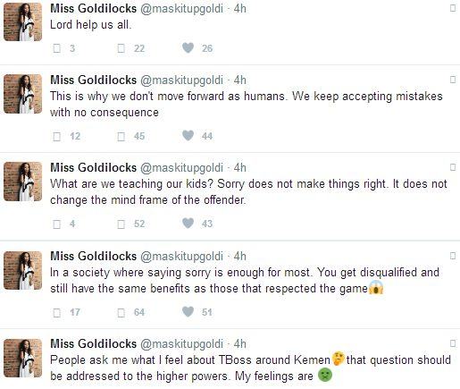 BBNaija: ‘Why is Kemen enjoying spotlight like others’ – Tboss’ sister Posted by: b3rrilyn in Celebrity News Apr 16, 2017 BBNaija contestant, Tboss’ sister is not happy with disqualified BBNaija housemate, Kemen, getting as much media attention as other housemates who followed the rules of the competition till the end. Read her posts below Kemen Tboss Wendy 2017-04-16 b3rrilyn