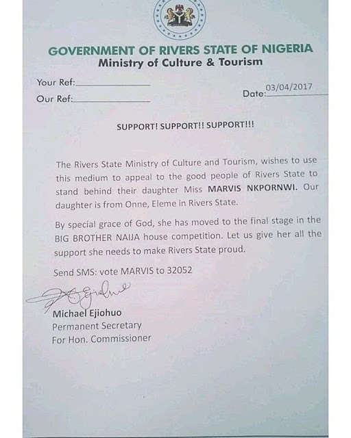 In the letter dated 3/4/2017 and signed by Michael Ejiohuo on behalf of the Rivers State Commissioner for culture and tourism, it is expected that everyone will support Marvis Nkpornwi to win the competition and also make Rivers State proud.