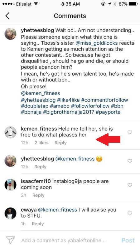Wendy Idowu, Sister to the 2nd runner up of the Big Brother Naija TV show, Tboss Idowu, yesterday, took to Twitter to slam the organizers of #BBNaija for giving Kemen the same celebrity treatment as other ex-housemates.