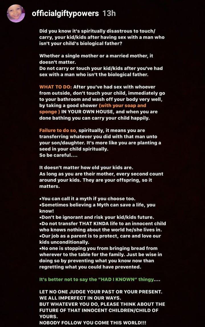 Her words, “Failure to do so, spiritually, it means you’re transferring whatever you did with that man unto your son/daughter. It’s more like you’re planting a seed in your child spiritually.”