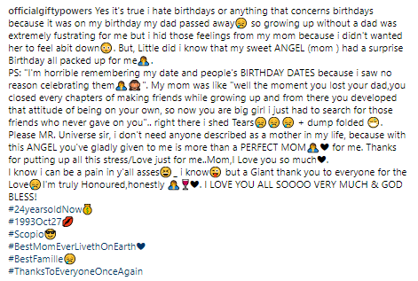 Former Big Brither Naija housemate, Gifty claims she’s celebrating her 24th birthday today! The actress also shared an emotional post about how the loss of her father affected her special day many years ago with lasting effects till today. Read below