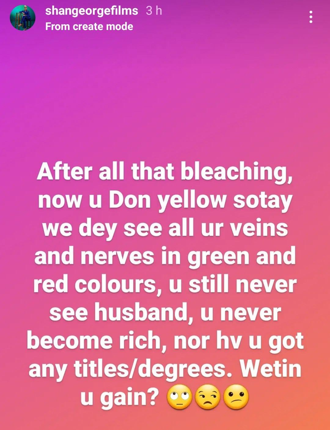 According to her, only a shameless woman will bleach to find a husband and still end up finding nobody.