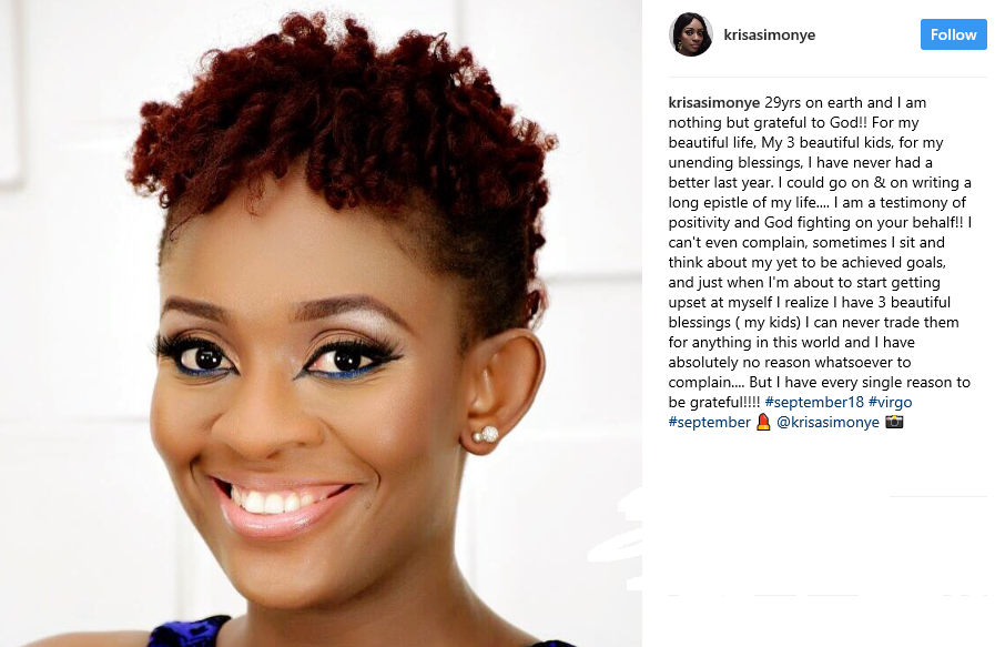 29yrs on earth and I am nothing but grateful to God!! For my beautiful life, My 3 beautiful kids, for my unending blessings, I have never had a better last year. I could go on & on writing a long epistle of my life…. I am a testimony of positivity and God fighting on your behalf!! I can’t even complain, sometimes I sit and think about my yet to be achieved goals, and just when I’m about to start getting upset at myself I realize I have 3 beautiful blessings ( my kids) I can never trade them for anything in this world and I have absolutely no reason whatsoever to complain…. But I have every single reason to be grateful!!!! #september18#virgo