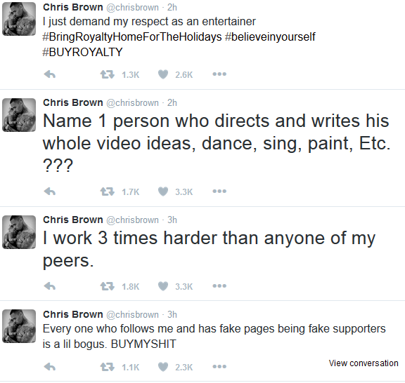 Buy my Sh*t – Chris Brown appeals to fans to buy his Royalty album Posted by: b3rrilyn in Celebrity News Dec 24, 2015 Adele pushed his album from number one on the ITunes chart to number two.. He took to twitter to call on fans to buy the album, saying he works thrice as hard as most artists.. Chris Brown 2015-12-24 b3rrilyn