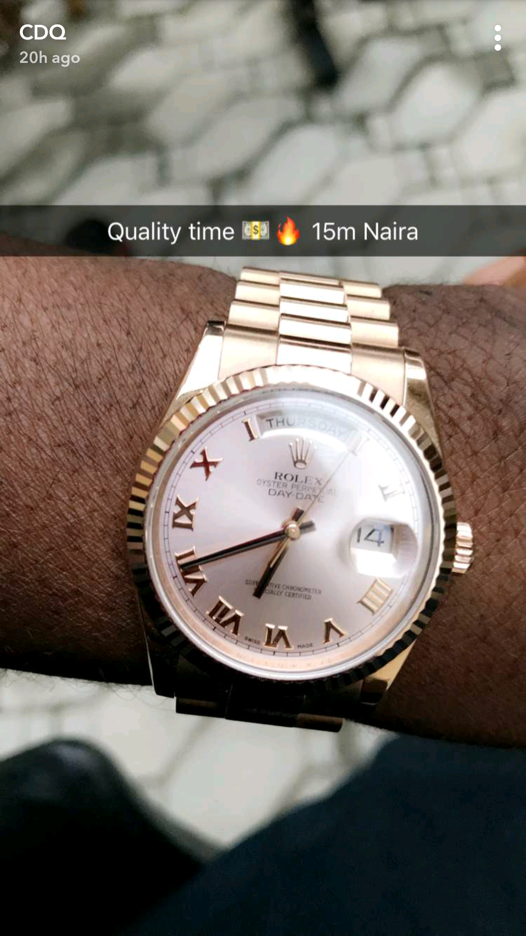 CDQ Claims To Be Wearing A Watch Worth N15million Posted by: Nonso in Celebrity News Sep 15, 2017 Singer CDQ took to his Snapchat page today to show off his Rolex watch – which he claims is worth 15 million naira. CDQ 2017-09-15 Nonso