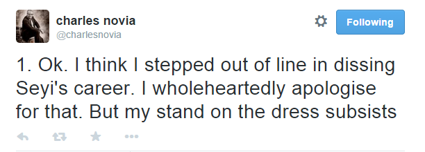 Charles Novia is a gentleman afterall, guys. Minutes after he took to Twitter to slam singer Seyi Shay over the sheer outfit she rocked to the Channel O awards, Charles has apologized, even though his stand on the dress subsists.