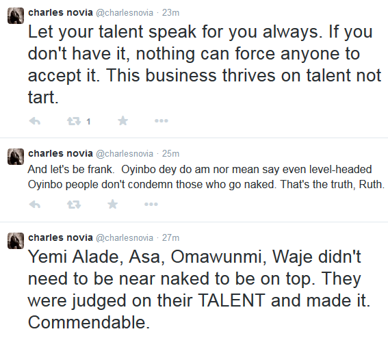 Nollywood producer and director Charles Novia just took to twitter to slam singer Seyi Shay over the sheer black dress she wore to the Channel O awards last weekend.
