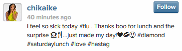 Chika Ike get Diamond ring from her boo | Photo Posted by: b3rrilyn in Celebrity News Apr 12, 2014 Chika Ike just got a massive diamond ring as a gift from her boo, who I hear is not Nigerian. She showed off the ring on her instagram page today. Chika ike 2014-04-12 b3rrilyn