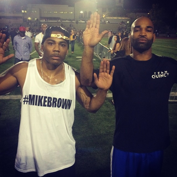 At the end of the game, Missouri native Nelly got on the mic and asked everyone to put their hands up and say “Don’t Shoot” in protest of the police shooting that left African-American teenager Michael Brown dead in Ferguson, Miss. Chris, Bow Wow, Trey, Lil Mama, Wale, and the rest of the stadium stood in solidarity with their hands up.