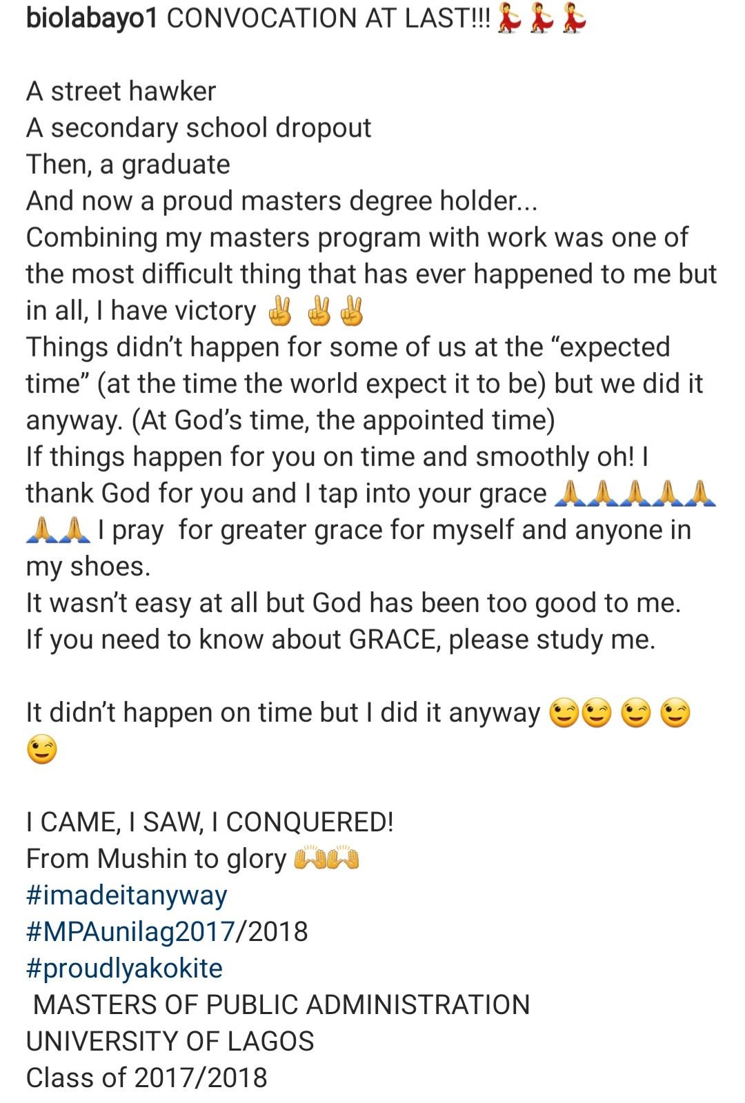 According to her, she went from being a street hawker to a secondary school dropout before finally acquiring her university degrees.