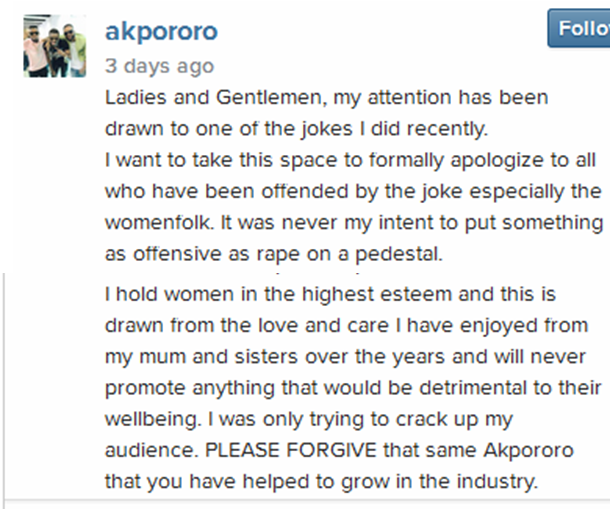 Comedian Akpororo apologizes for rape joke Posted by: b3rrilyn in Celebrity News Apr 14, 2015 Last week, some people criticized a rape joke made on stage at the AY show by comedian Akpororo. After receiving backlash over his choice of words, Akpororo took to instagram to publicly apologize. Akpororo 2015-04-14 b3rrilyn