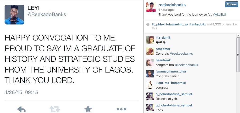 21 year old, Mavin records artist Reekado Banks is now a graduate. The singer took to Twitter today to announce that he was now a graduate of History And Strategic Studies from the University of Lagos.
