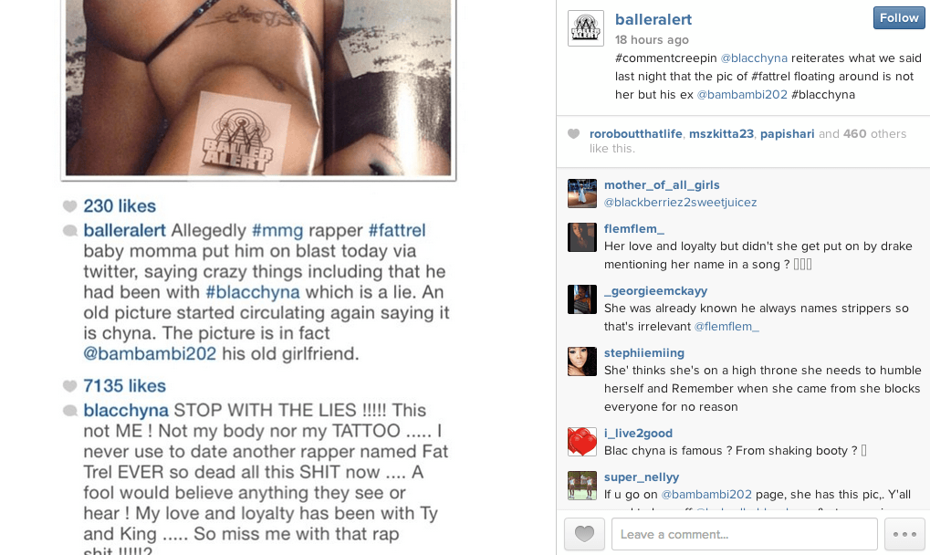 We posted earlier that Tyga and Blac Chyna parted ways. Well, reports has emerged that Blac Chyna cheated on Tyga with Fat Trel, photos emerged of him licking the a$$ of a lady who has the same tattoo Blac Chyna has. Blac Chyna has denied this but it seems her man is not buying her story, see below: