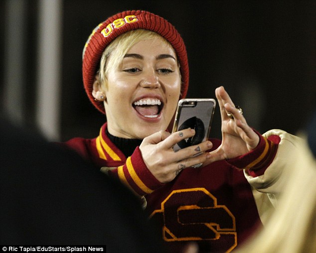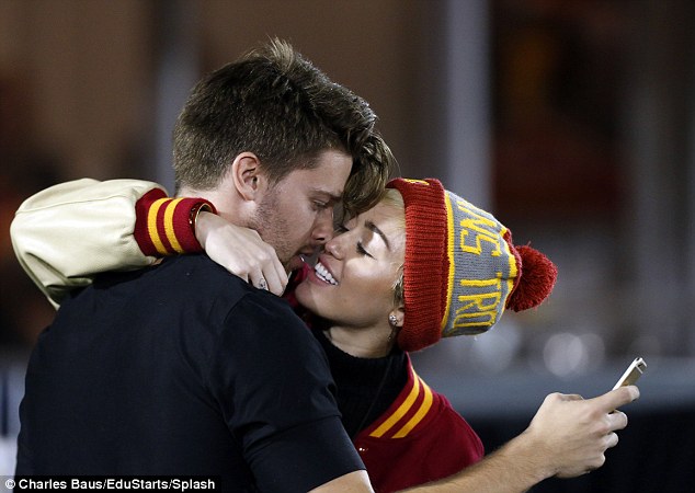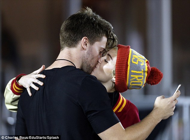 Patrick Schwarzenegger is the first son of action hero Arnold Schwarzenegger and Maria Shriver and he’s gorgeous. There were reports that Miley was dating Patrick after they were spotted out on several dates in LA but nothing was confirmed until yesterday when the two locked lips in full view of spectators during a football game yesterday at the LA Memorial Coliseum. Patrick is 21, Miley will soon turn 22