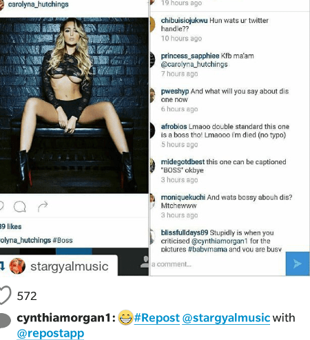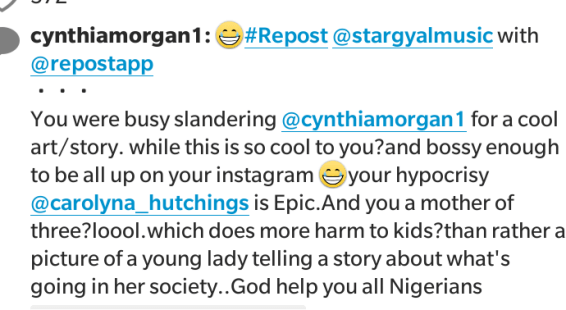 Cynthia Morgan took another shot at Caroline Danjuma by reposting a photo Caroline posted of a scantily clad model, with half her boobs on display on instagram & basically calling her a hypocrite.
