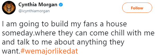 Cynthia Morgan has gone ahead to reveal that she has plans to sometime in the nearest future build her fans a house.