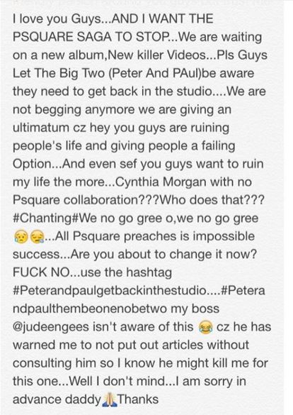 Cynthia Morgan Urges Psquare to get back together with this Touching Message