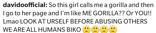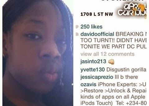 Why in this world will someone just call anybody a disguiting gorilla and believe me there is little we all can take as this girl took to Davido’s instagram page and called him ‘Disgusting Gorilla’