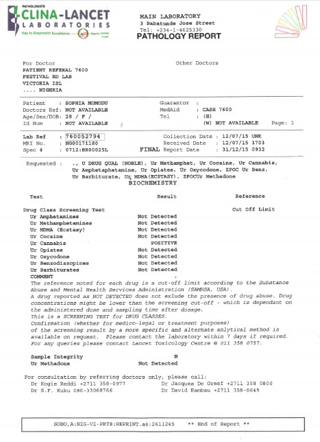 Imade was in her custody for 2 straight months, unchallenged and uninterrupted, until the baby took badly and severely ill in July. Imade cried, ceaselessly, for 48 hours. She was rushed to the hospital where her condition confounded medical experts. Several tests were conducted on her and later on the mother. Medical reports, herein attached (exhibit 1), proved that Sophia’s blood was polluted to the maximum level with cannabis and she had by the process of breastfeeding infected her child with complicated medical conditions associated with the use of alcohol and especially cannabis. The trouble spot for Imade was her lungs. She had difficulty breathing largely because of the contaminated breast milk and the severity of the ‘Second Smoke’ of marijuana inhaled by the poor child.