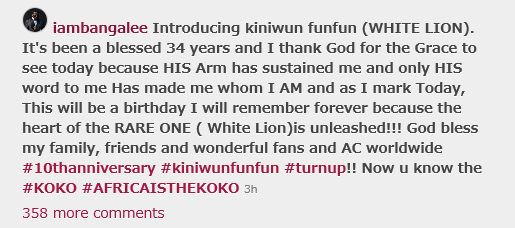 Introducing kiniwun funfun (WHITE LION). It’s been a blessed 34 years and I thank God for the Grace to see today because HIS Arm has sustained me and only HIS word to me Has made me whom I AM and as I mark Today, This will be a birthday I will remember forever because the heart of the RARE ONE (White Lion) is unleashed!!! God bless my family, friends and wonderful fans and AC worldwide #10thanniversary #kiniwunfunfun #turnup!! Now u know the #KOKO #AFRICAISTHEKOKO