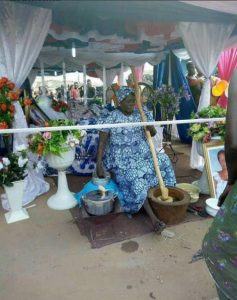 There are so�many things that happen around the world and it is with the help of social media can we be able to peep through some of this happening. This is one of the strangest things I have seen during a wake-keeping, lying in state or even burial, should I describe this as sitting in state. A woman who was purportedly a food vendor (mama put) before she died was the center of a bizarre situation as she was lying in state or should I say sitting in state. The ceremony took place somewhere in Ghana, instead of the body to lie and people would go round to pay their last respect to her in the casket the supposed dead woman body was set up in a sitting position with a pestle on her hand and a mortar with pounded yam and some other items she used when cooking when she was alive, as if she was in her kitchen…… when you think there is nothing new under the surface of the sun and you see something of this nature.