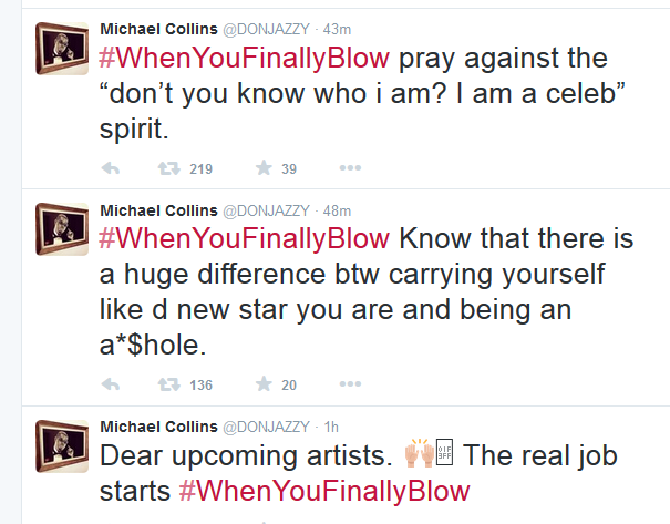 Dear Nigerian Artists, Donjazzy has some wise words for #WhenYouFinallyBlow Posted by: b3rrilyn in Celebrity News Aug 30, 2015 Don Jazzy, for unknown reasons, took to his Twitter page to share some home truths with budding and upcoming artistes on the power of fame and how it quickly diminishes and destroys artistes Don Jazzy 2015-08-30 b3rrilyn