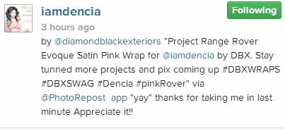 Dencia customizes her Range Rover to pink | Photo Posted by: b3rrilyn in Celebrity News May 3, 2014 Dencia acquired a 2014 Range Rover and many people said it’s a rented car and she couldn’t afford it. I guess she is trying to prove she actually owns the car Dencia 2014-05-03 b3rrilyn