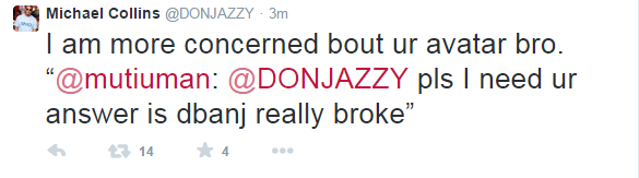 Don Jazzy reacts to reports that D’banj is broke Posted by: b3rrilyn in Celebrity News Jan 24, 2015 Reports of Dbanj facing financial difficulties keep getting stronger, one fan felt it would be better to ask his former partner, Donjazzy.. Donjazzy gave replied with I am more concerned about your avatar bro Now see the fan’s avatar below Dbanj Don Jazzy 2015-01-24 b3rrilyn