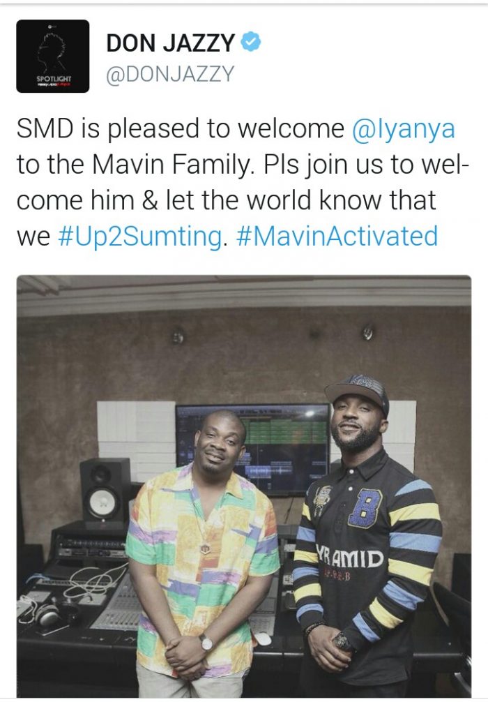 Don Jazzy took to his Instagram page to announce that Iyanya has been signed to his Mavin Records.