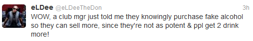 eLDee reveals clubs sell fake alcohol to their customers Posted by: b3rrilyn in Celebrity News Aug 23, 2013 That’s deep! That’s illegal.. and people should start calling out these clubs before they kill people.. Eldee 2013-08-23 b3rrilyn