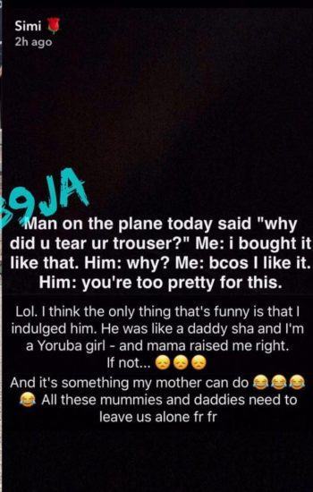 Elderly Man Blasts Simi’s Outfit on a Plane Posted by: b3rrilyn in Celebrity News Jul 29, 2017 Simi who has a quite unique dress sense was questioned by an elderly in a flight cross country recently. The man asked why the singer tore her jeans and why she looks in a way. Check out their conversation below Simi 2017-07-29 b3rrilyn