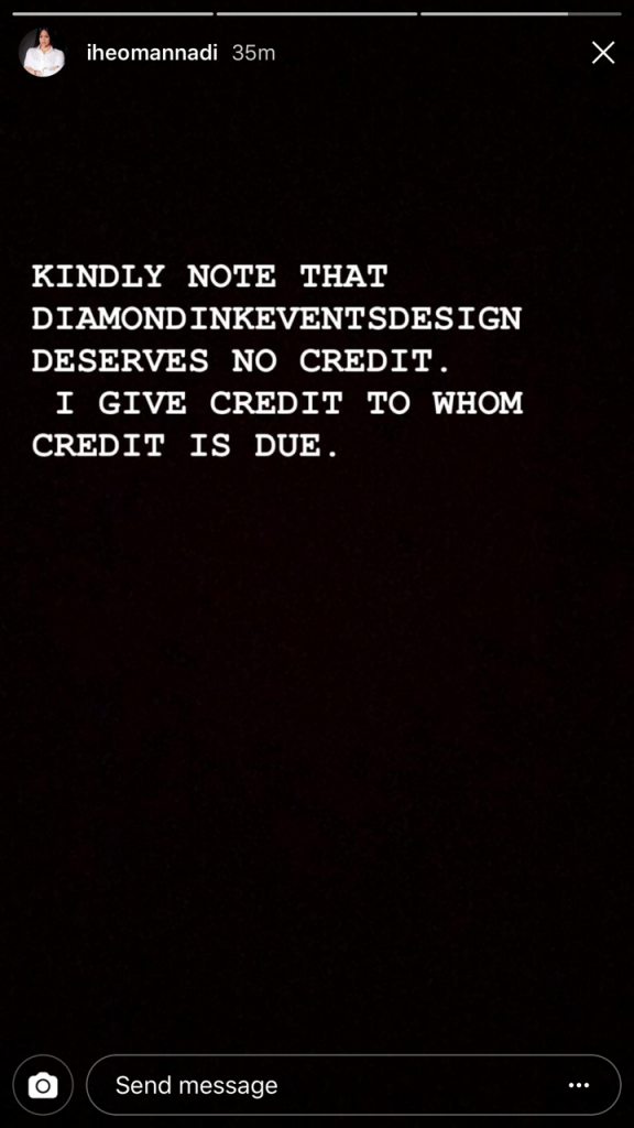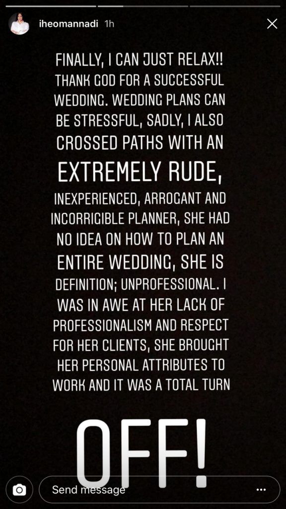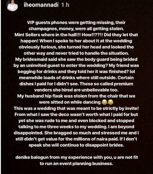 According to Iheoma, the wedding planner, Nike Balogun popularly knowns as Diamonk Ink Events, was extremely rude, arrogant, unprofessional and incorrigible throughout the planning process.The ex-beauty queen further stated that the shoddy job done by the wedding planner made people lose their properties.