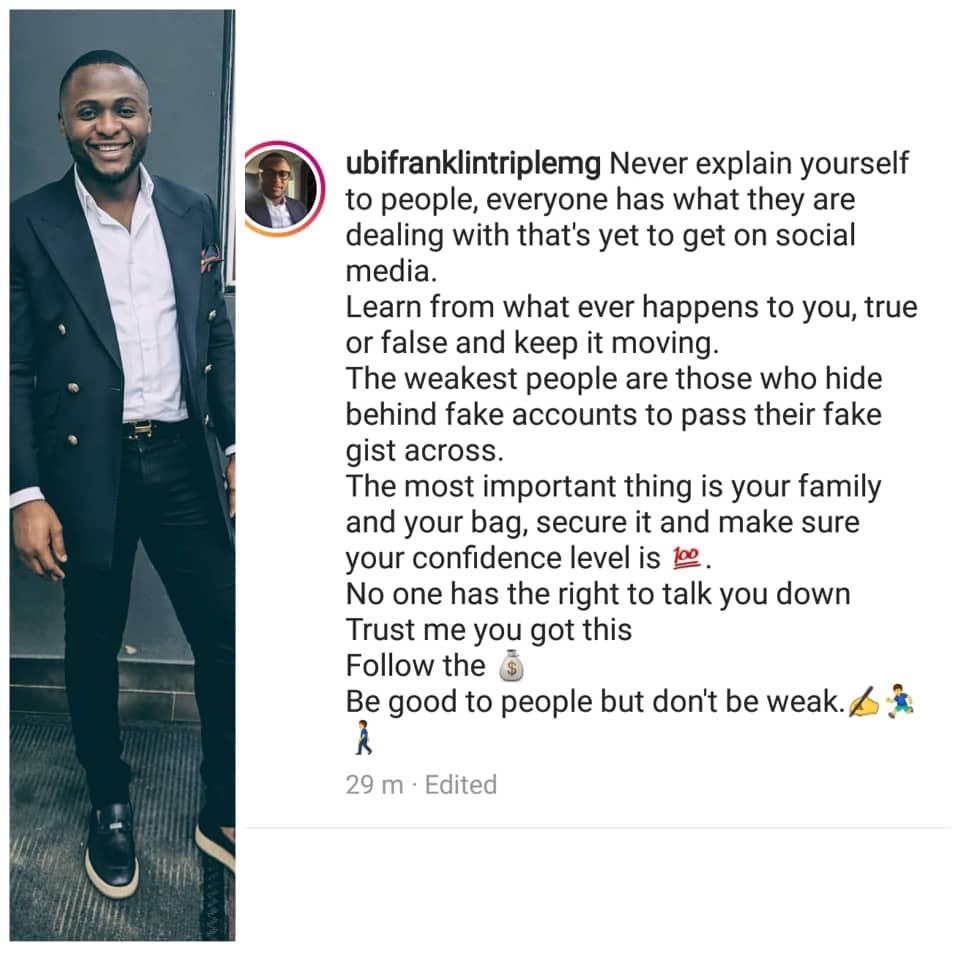 Popular record label owner, Ubi Franklin has had his say on anyone who hides behind a fake account to spread fake news.