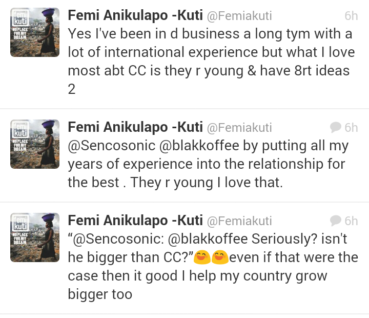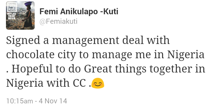 Femi Kuti, son of afrobeat legend, Fela Kuti just made this announcement on twitter. He has signed a deal with Chocolate City to manage his affairs in Nigeria.