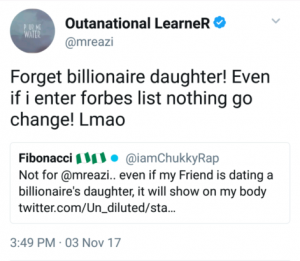@iamchukkyrap tweeted ‘Not for mreazi. Even if my friend is a dating billionaire’s daughter, it will show on my body.’