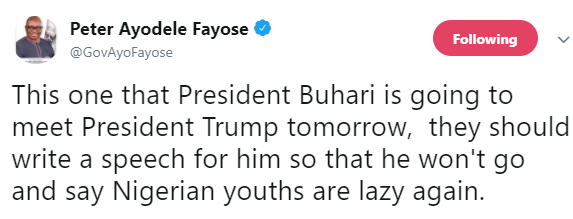 President Buhari Should Be Given A Speech To Read During His Meeting With President Donald Trump Today – Governor Fayose Posted by: giftfumi in News, Politics Apr 30, 2018 The governor made the appeal on his twitter handle. Fayose 2018-04-30 giftfumi