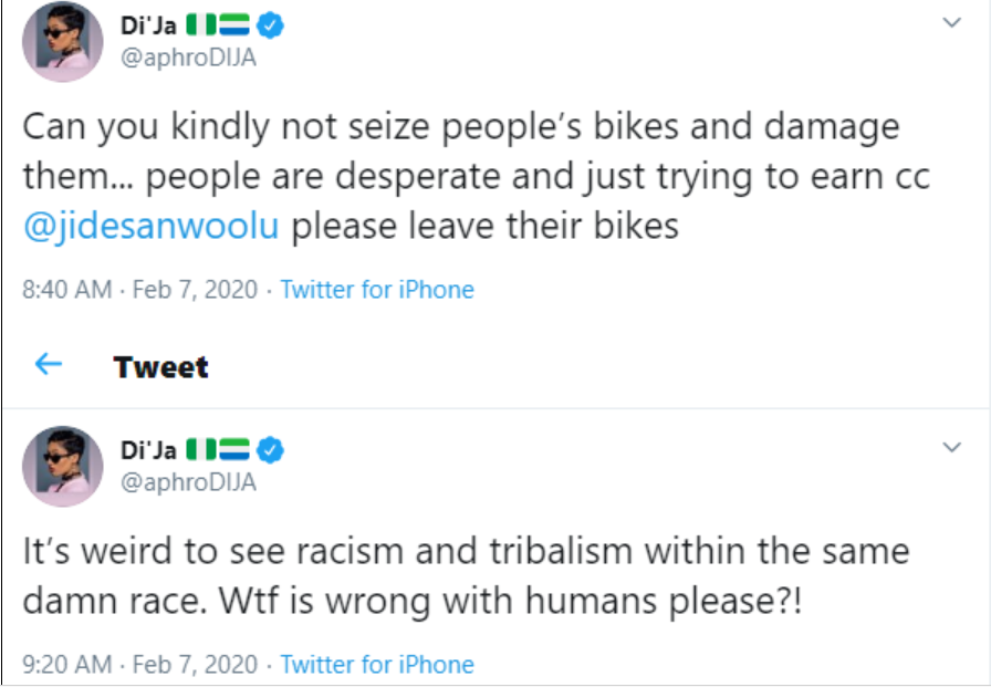 She added that the seizing and damaging of peoples bikes is not acceptable because these are Nigerians that are just trying to feed.