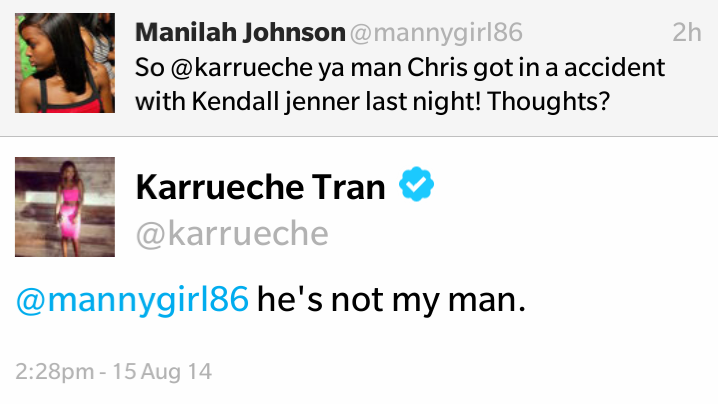 He is not my man – Karrueche confirms split with Chris Brown Posted by: b3rrilyn in Celebrity News Aug 15, 2014 So it’s official guys, they have parted ways. It’s no longer speculations Chris Brown karrueche 2014-08-15 b3rrilyn